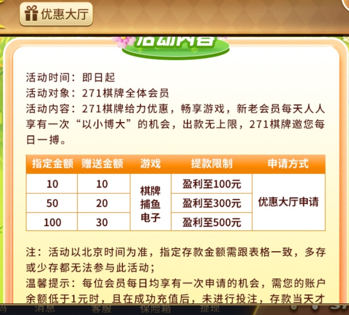你看这个玩吗,这个台有个包赔100,如果充100亏损,第二天领取100,一杯水提