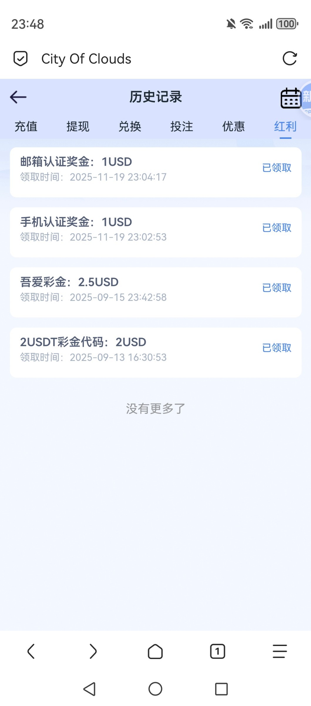 存过100以上的去看一下,在自助里,一个手机认证彩金一个邮箱认证彩金,都是10倍流水。
