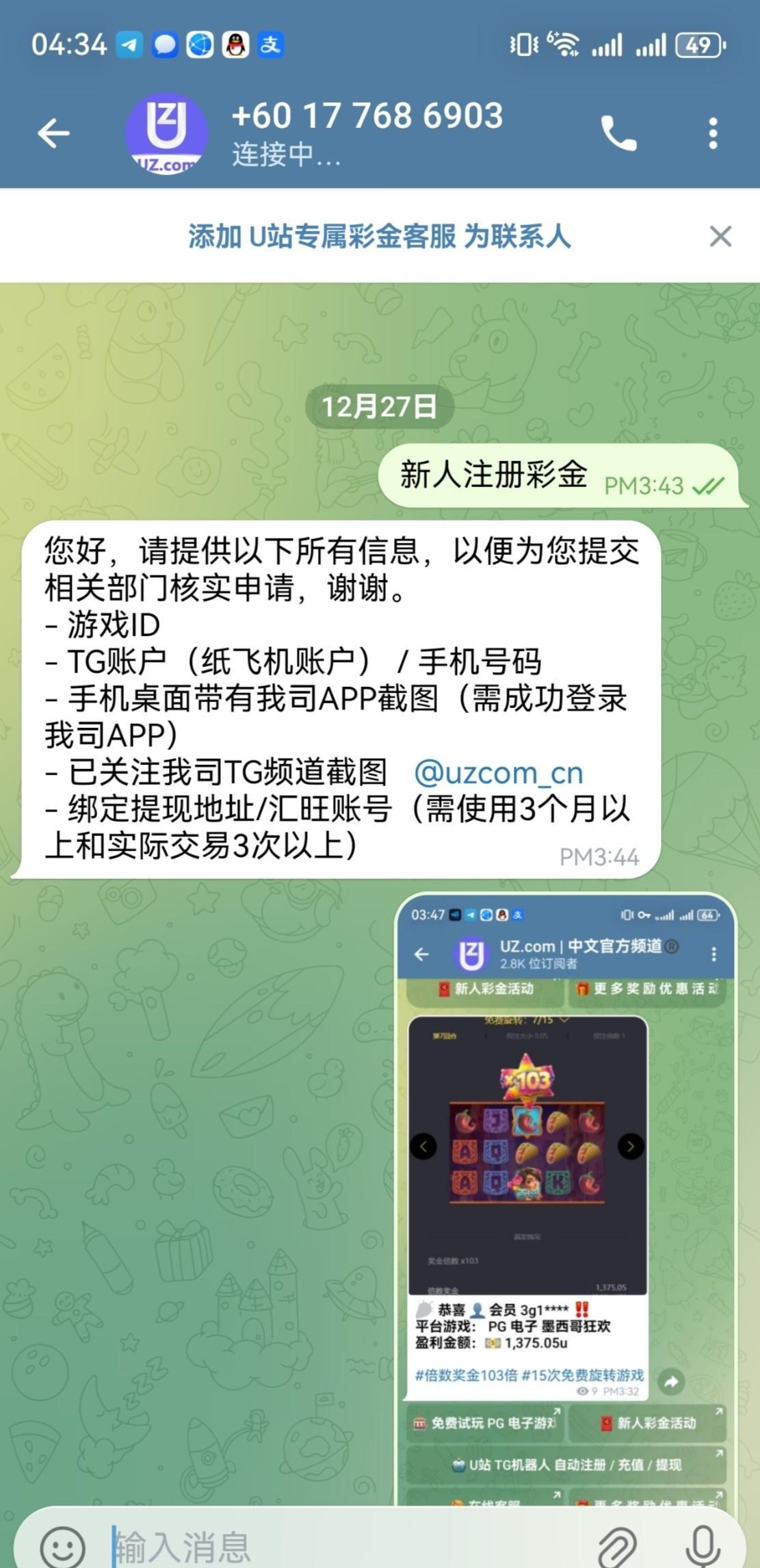 飞机上看到的,新人注册送9.99u,按客服要求绑定出款地址,关注频道就送,提款最低50u,需最低充值5u,我没打出来,老哥们可以去试试,网址uz.com