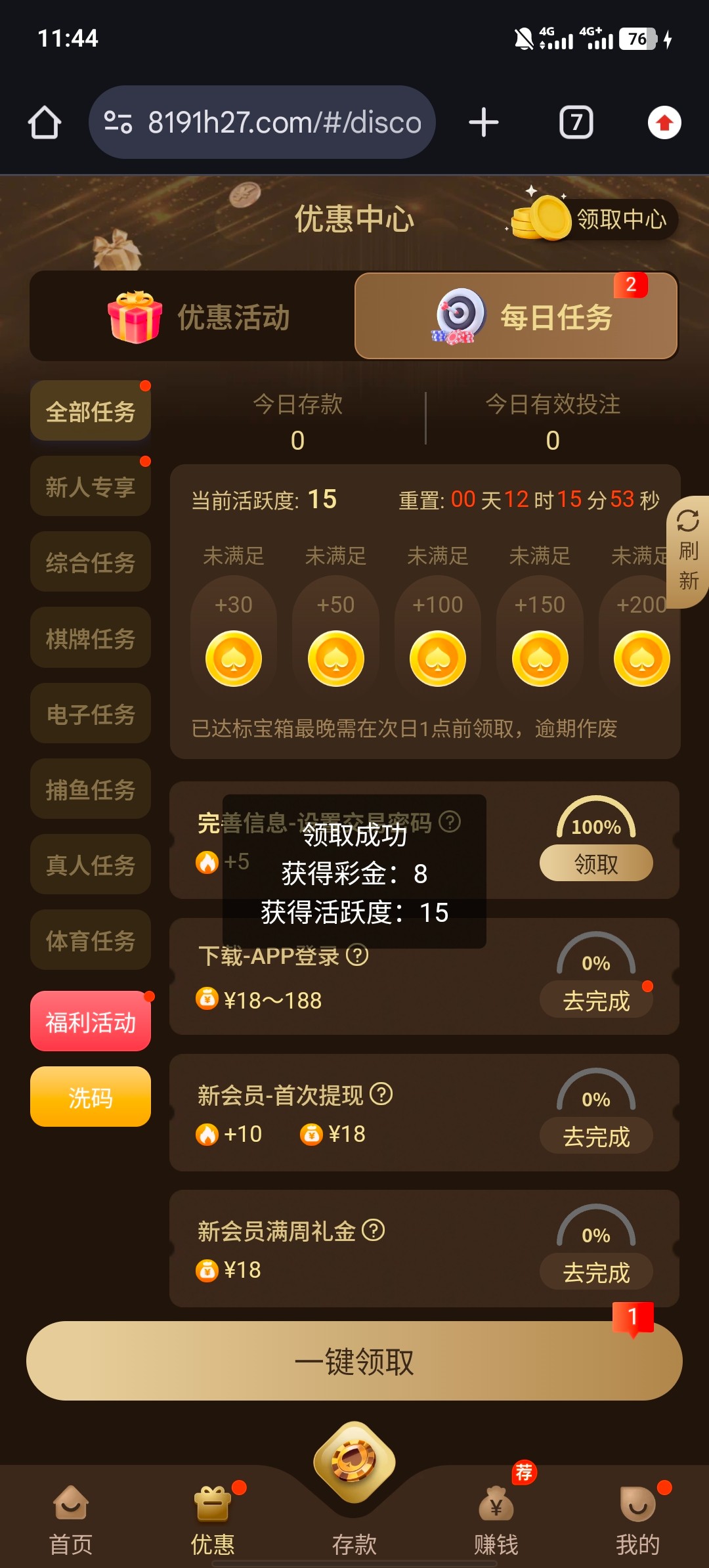 个人中心 完善信息 自助领取8元 赌神彩金 盈利满100即可出款 半黑 不查ip