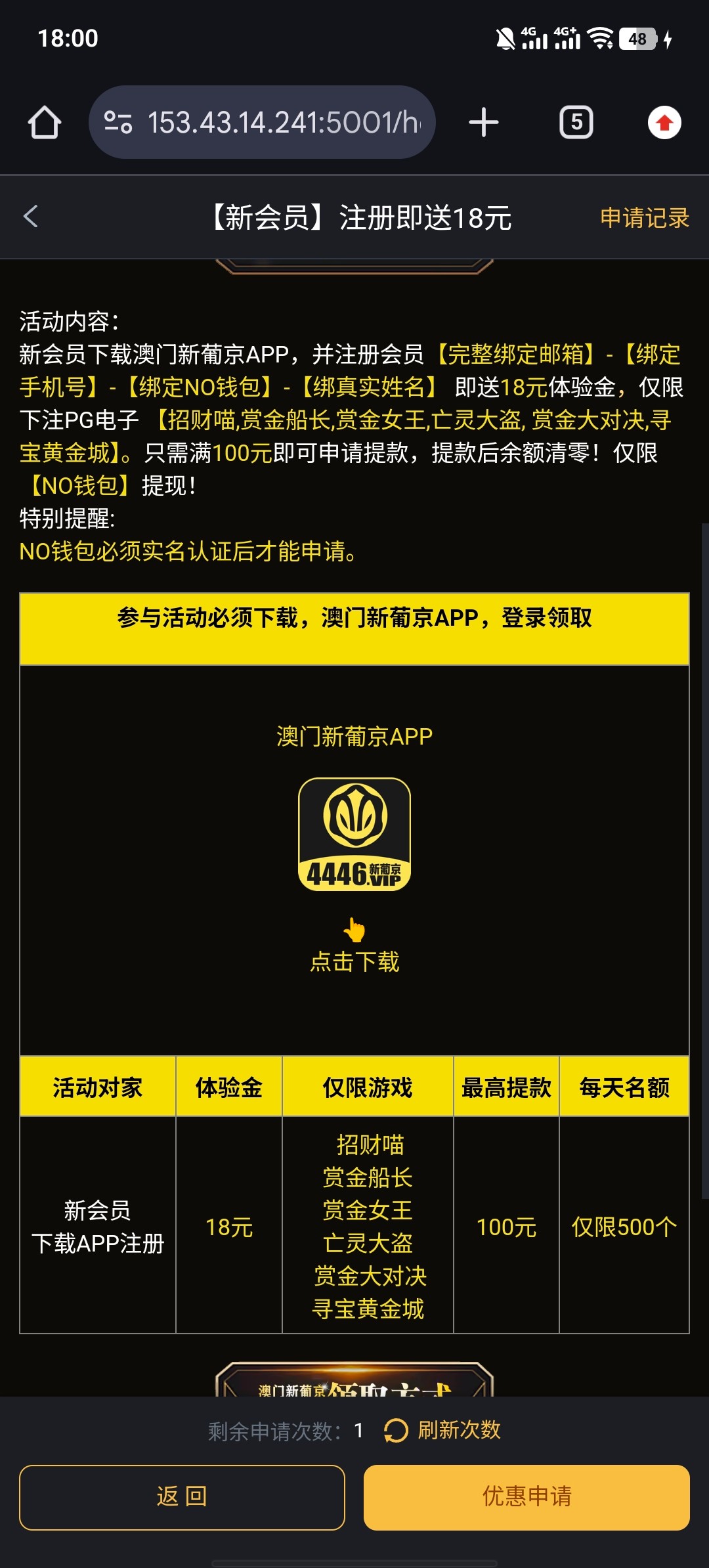 现在 大多数平台接码那些彩金 有两个不同的活动入口 一个是特邀的 用特邀手机号码直接注册就能显示活动入口 一个是平台的下载app活动入口 都是18彩金 想告诉一下大家 现在大多数平台 都是这样子了用指定特邀手机号码注册才显示那个活动入口 用账号注册的话没有那个活动入口 这是我昨天晚上注册的直接给我显示那个特邀活动 入口