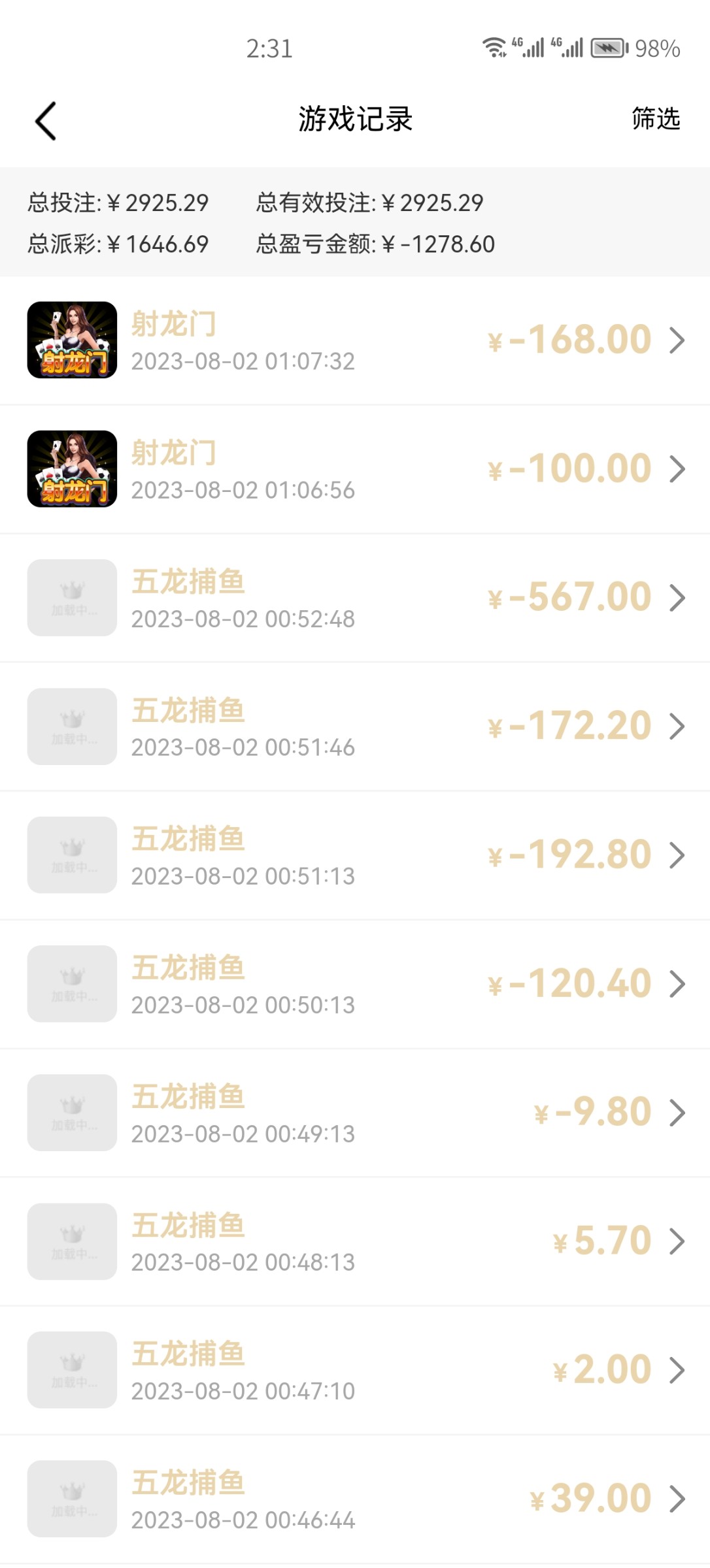 五龙捕鱼最容易上头,之前我开那个一块钱的炮,旁边那个六倍的,一炮六块钱,一条龙没打死,挂了