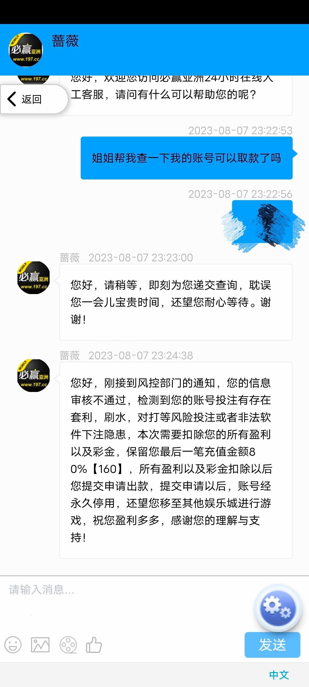 好几天之前的了,之前一直没有心情发出来。先大概说一下是怎么被黑的,这个台之前我没有充值玩,是看论坛里老哥们发的说有福袋抢去玩的,前面白嫖个几十一百的都正常出了,后面开始慢慢的充值,一开始充的少,5块10块的,感觉没什么问题了就开始100  200这样充,但是不常玩这个台子,可能一个月就玩那么两三天,大概在上个月的时候,我忘了充了多少了,但是几百块是有的,红了2k,在号里留了1k然后提了1k出来,结果迟迟不到账,问客服就是说审核,当时抱着已经被黑的心态把号里剩下的钱嚯嚯完了,结果等了一天到账了。这个月又去玩,上了200进去,打到了3000多,提3k不到,等了一天退回,让等审核,无聊又用退回来的3000打上了10000,再去问客服能不能提现了,说是刷水套利退还本金80%冻结账号。