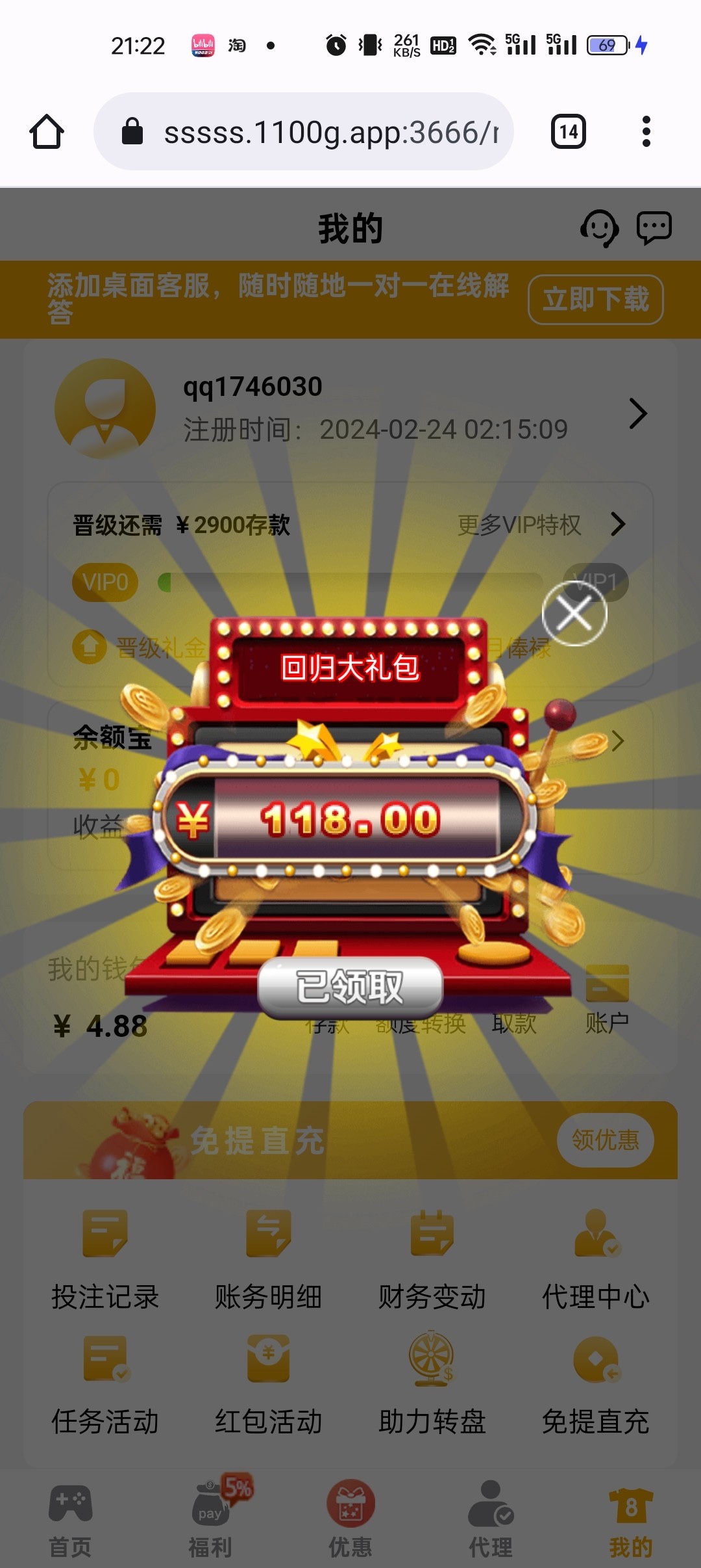 老用户登录看看有没有回馈彩金,有的直接回馈118彩金,好像充值过的才有,具体自测吧。