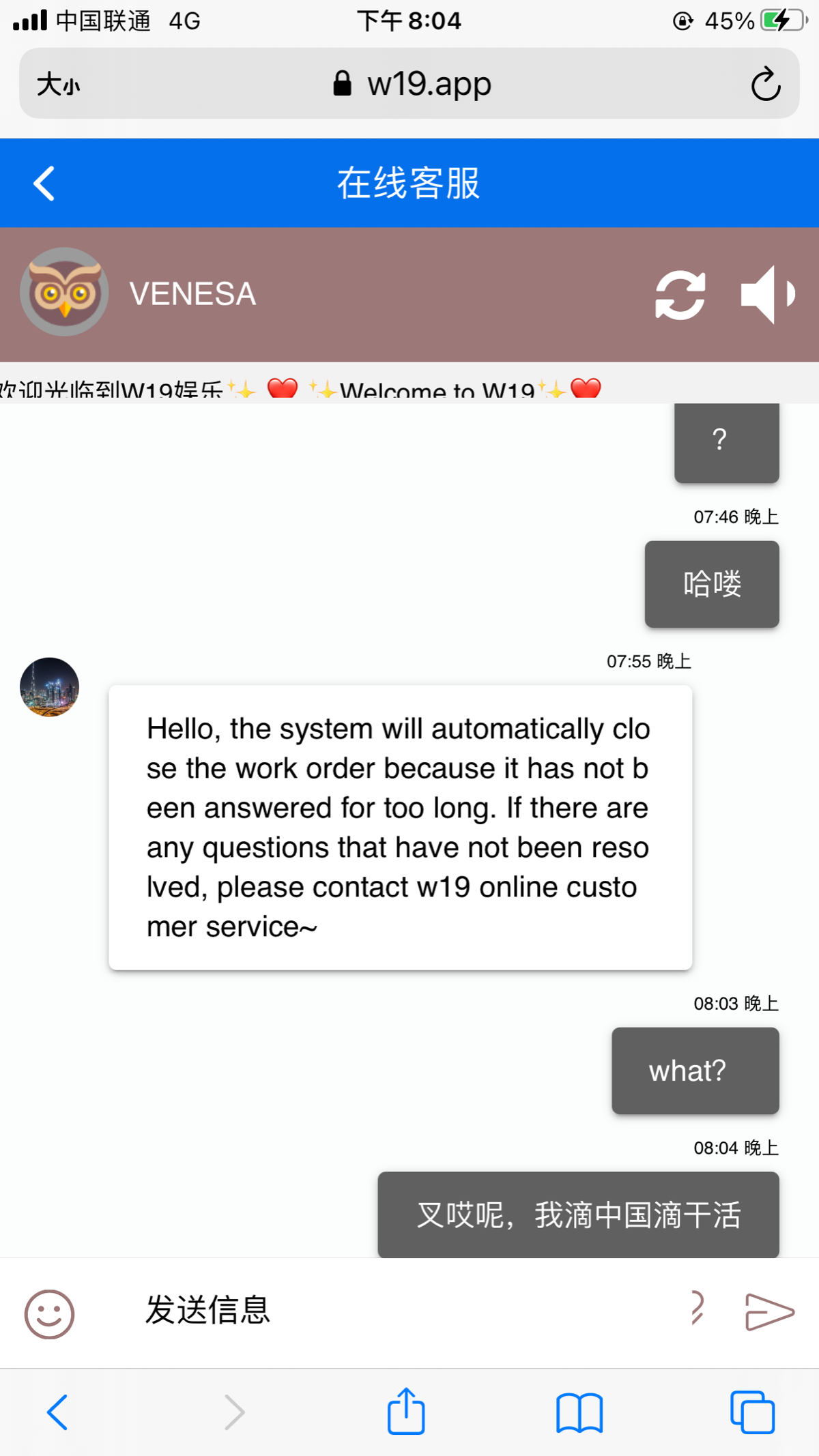 您好,系统将自动删除工作单,因为它已经很久没有回复了。如果还有任何问题没有解决,请联系w19在线客户服务中心~