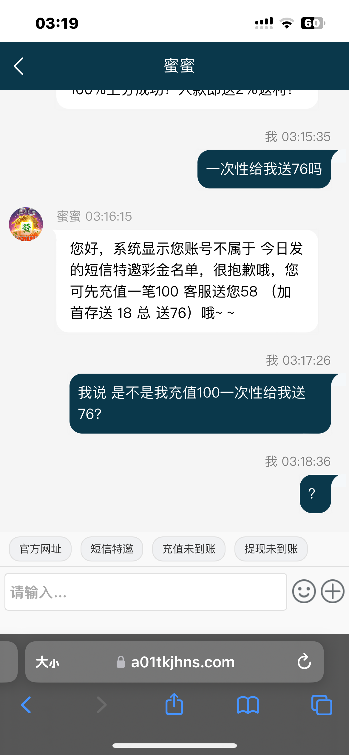 我也是这个,换个客服也是这样说,我冲了,客服给你送58,然后18在优惠里直接领,176一共328流水,出了400,麻将没水,女王可以