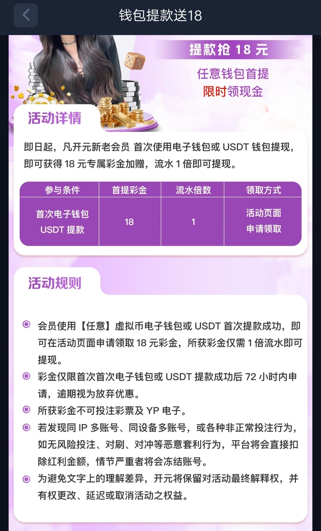 这个台有点水,前几天打过了出了,还有一个提款成功送18彩金,一个APP彩金,但是要求首存也在活动里。