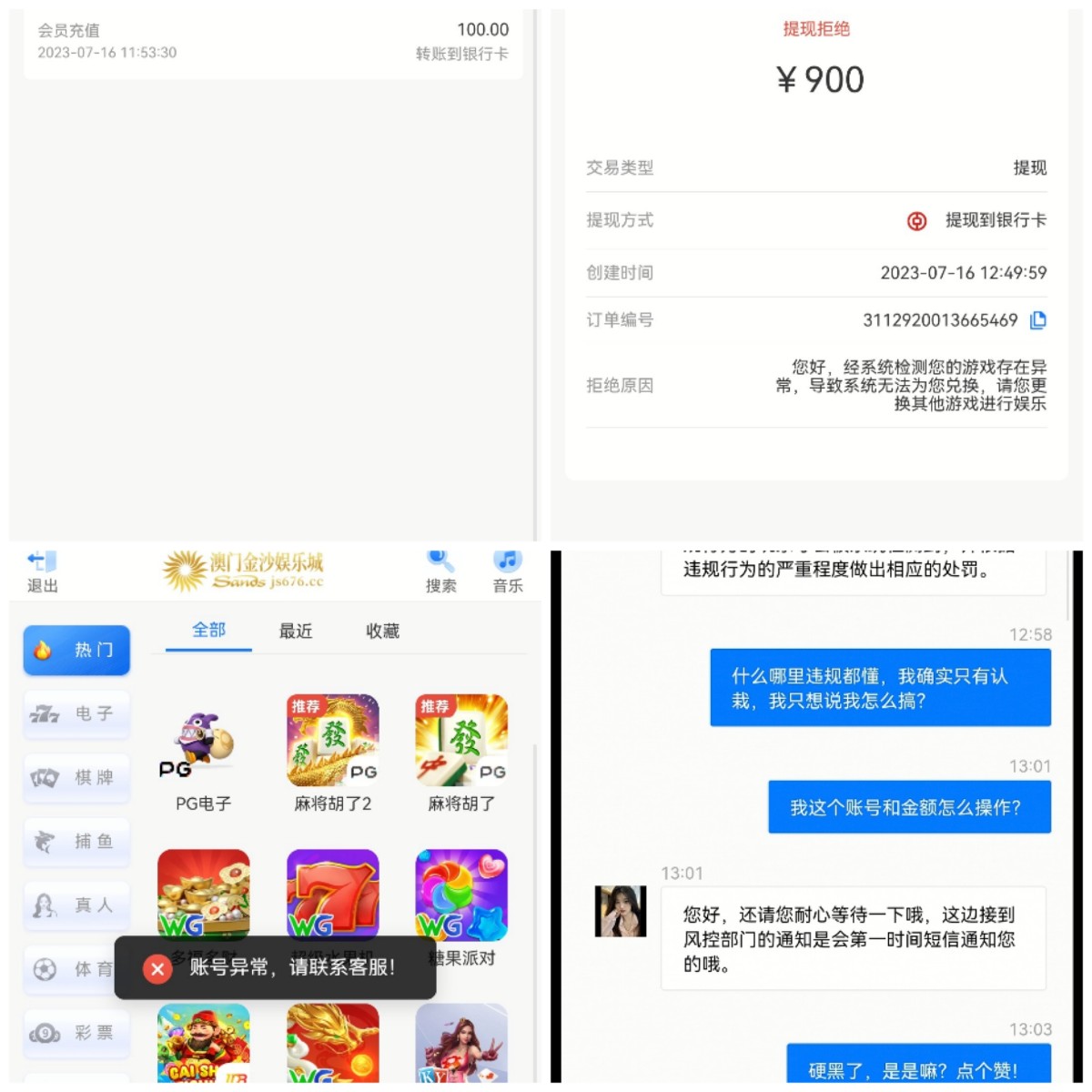 一个直接纯黑的平台,收条短信特邀,首存100送38,注册然后存款游戏,PG打到900块,试着去提款,果不其然,直接把你账号弄成异常,提款金额和存款本金硬吃。千万当心,各位!